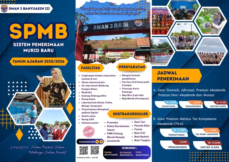 Telah resmi dibuka Sistem Penerimaan Murid Baru (SMPB) di SMAN 3 Banyuasin lll dengan beberapa jalur yaitu Jalur Domisili, Afirmasi, Fotensi Akdemik, Prestasi Non Akademik dan mutasi selain itu juga bisa lewat jalur Prestasi Tes Akdemik🥰