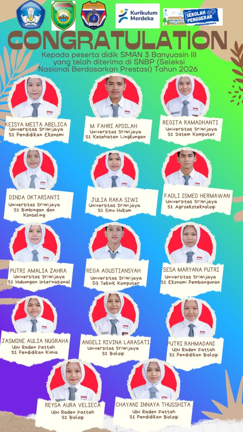 BANYUASIN – Sebuah kebanggaan besar kembali menyelimuti keluarga besar SMAN 3 Banyuasin III. Tahun ini, sebanyak 14 siswa terbaik berhasil melangkah pasti menuju gerbang perguruan tinggi negeri impian melalui jalur Seleksi Nasional Berdasarkan Prestasi (SNBP).